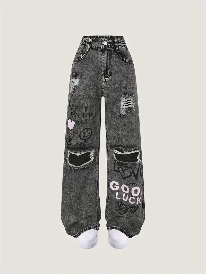 Jugendliche Denim-Jeans, zerrissene gerade Beine im Y2K-